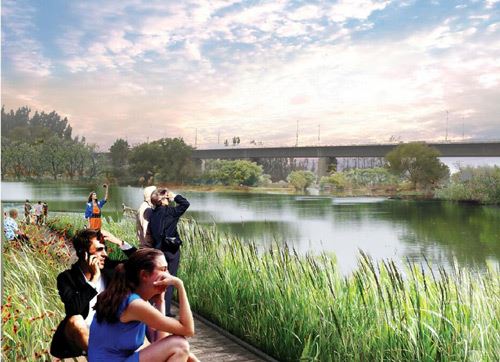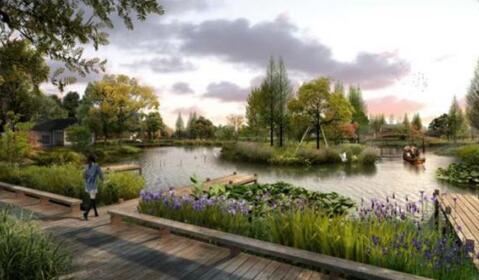 以荷花為主題,堤岸打造木棧道,河岸搭配蘆葦?shù)戎参?,充分發(fā)揮綠地效益。